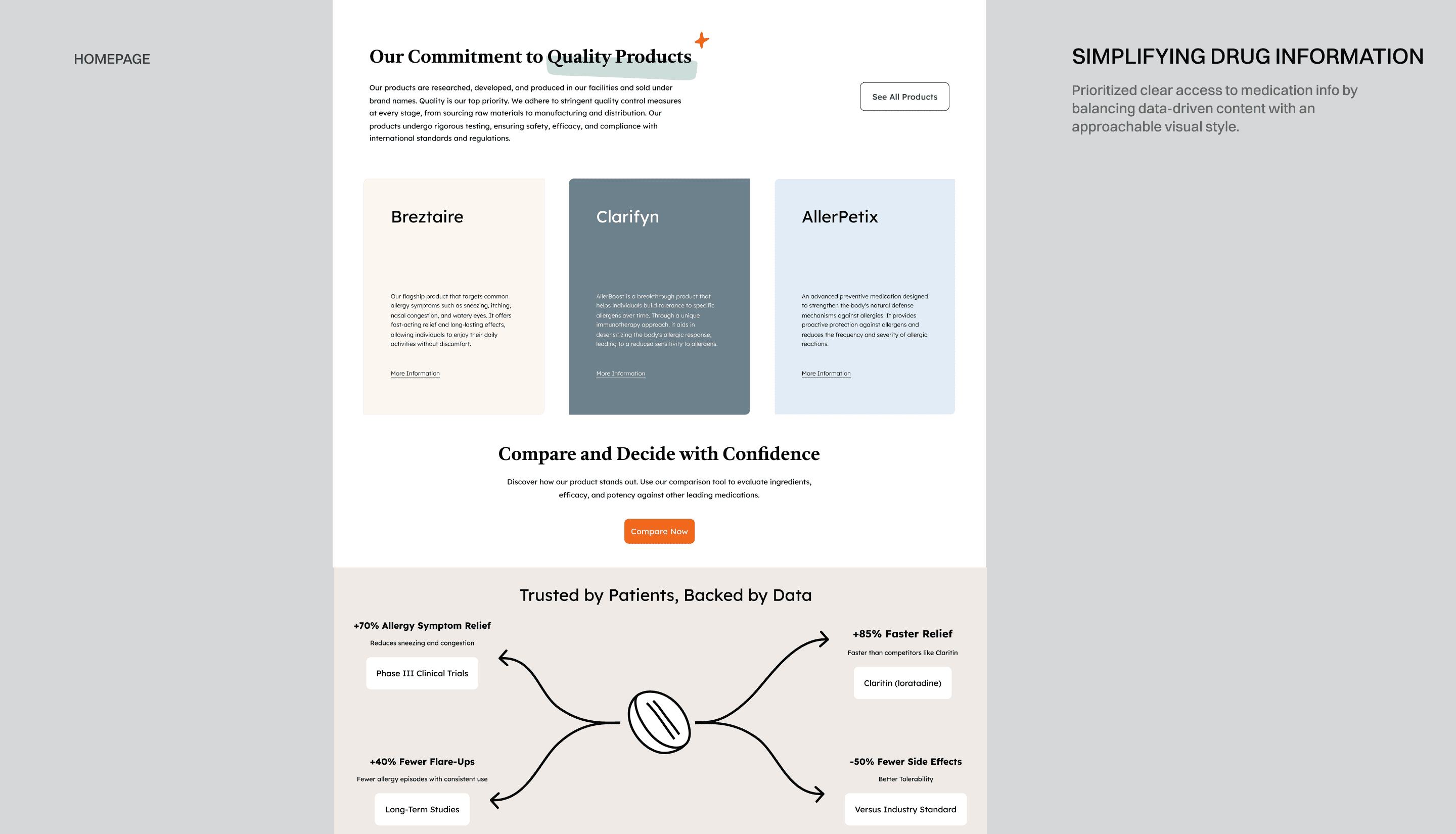 By breaking the site into three core pages, we ensured that users could easily navigate between general research, product exploration, and detailed medical breakdowns. This structure prioritizes accessibility and transparency.