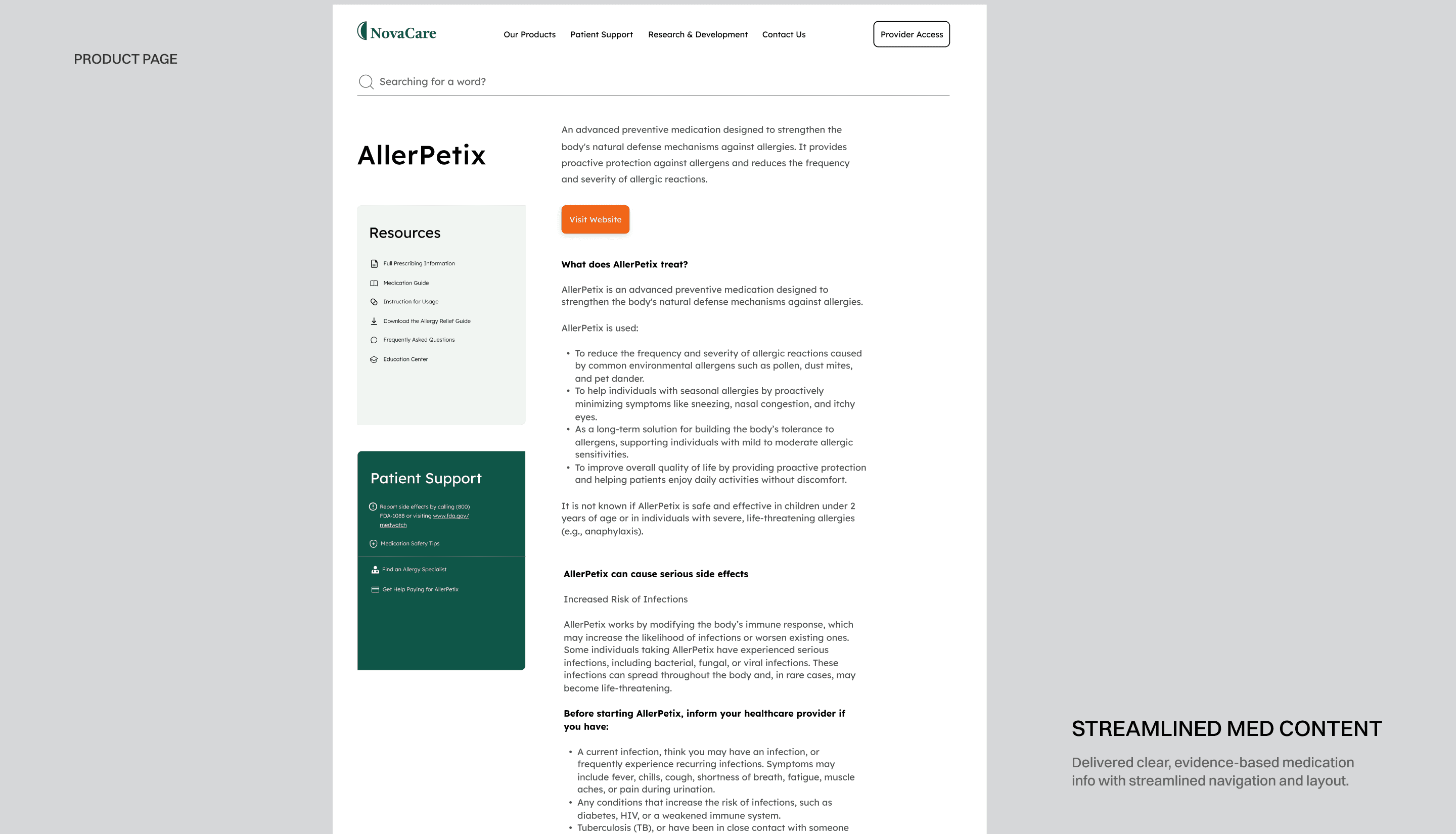 Patients & caregivers can feel overwhelmed by medical jargon and marketing-heavy content. I focused on clear language, intuitive navigation, and an approachable visual style so users can easily find and understand medication information.